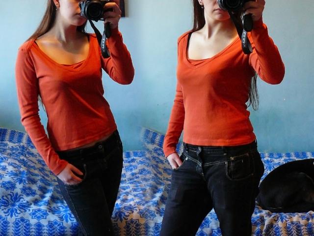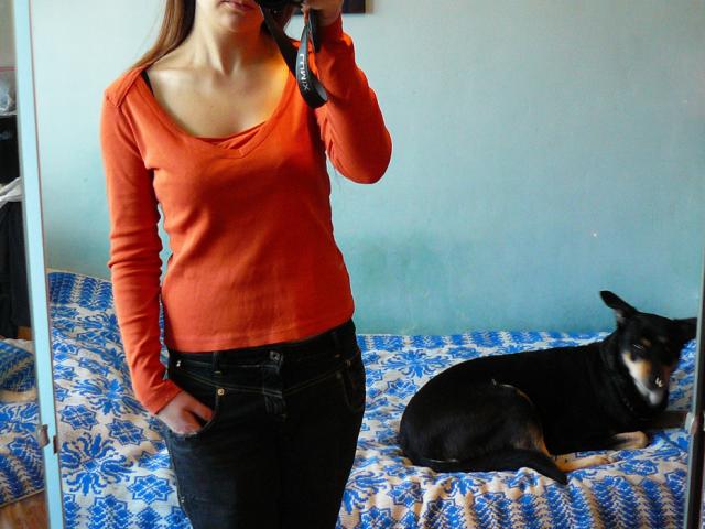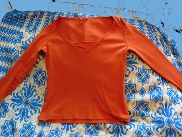 Oranžinė, nenublukus, nors gal ne tokia akinančiai ryški, kaip atrodo foto. S dydis parašyta, bet tiks ir toms kurios nešioja padidintą S :) Dėvėta buvo, bet dar puikiai atrodo.
