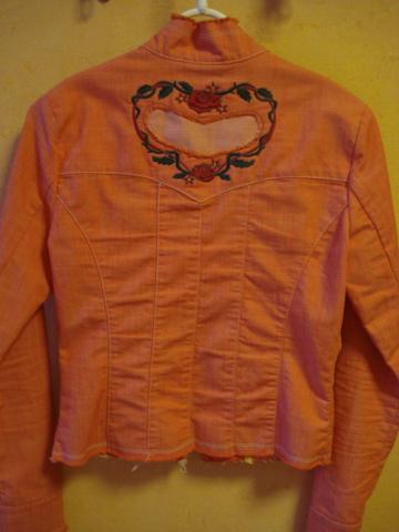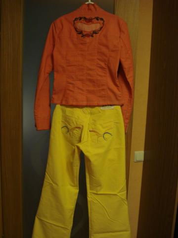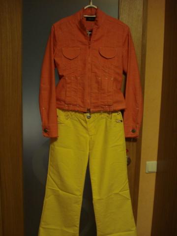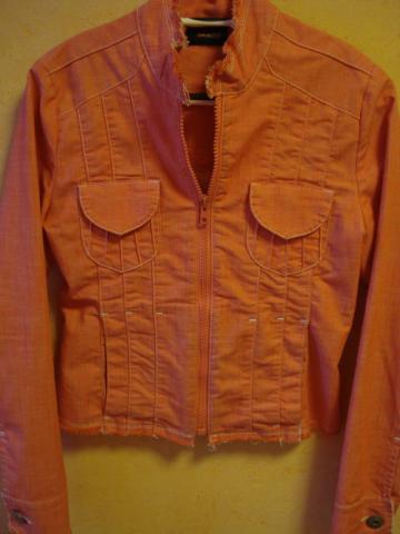 Labai gražus oranžinės spalvos džinsinis švarkelis, gražiai įliemenuotas, dailiai priglunda, nugaroj išsiūvinėta spalvota gėlė, kaip tik vasarai!!! Prekė labai kokybiška, nėra jokių defektų, beveik nauja, nes nešiojau labai mažai. Pirkau kartu su geltonom kelnėm, kaip komplektą iš "Džinsų centro", o kadangi šiuo metu man jau ankštas, kam laikyti be reikalo spintoj.