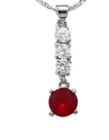 Raudonas rubino akmuo - pakabuko dydis 26 x 8 mm. Grandinėlė (apie 50 cm. sukta bangelėmis) ir metaline pakabuko dalis yra su 18 KGP prabomis (paauksuota baltu auksu).