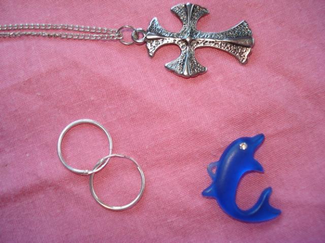 1. Auskariukai(rinkutes sidabrinės) 2. Pakabutis delfinas 3. Grandinėlė su pakabuciu kriziuku ;]]]