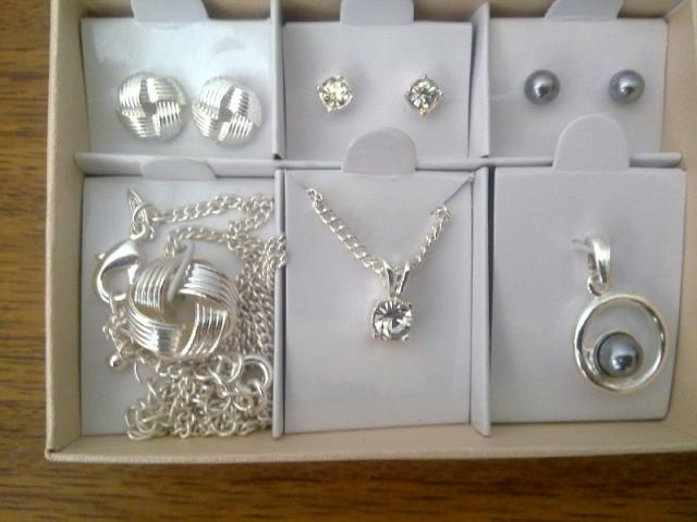 Naujas Avon papuosalu rinkinys. Yra dezute. Kaklo grandinele, 3 pakabuciai ir 3 auskaru poros. Kaklo papuosalo ilgis:42+9 cm; Pakabuciu skersmuo: ziedas su pilku karoliuku:0,7 cm; apvalus mazgas: 1,5 cm; skaidrus stiklo akmenelis ; 0,5 cm. Auskaru skersmuo: pilki karoliukai: 0,5 cm; apvalus mazgas: 1 cm; skaidrus stiklo akmenelis ; 0,4 cm.