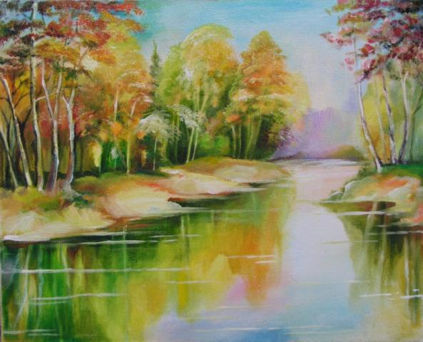 paveikslas''upelis'' . aliejiniai,drobe ant poremio 62x50cm.. skaidriu spalvu,labai pagyvina kambari