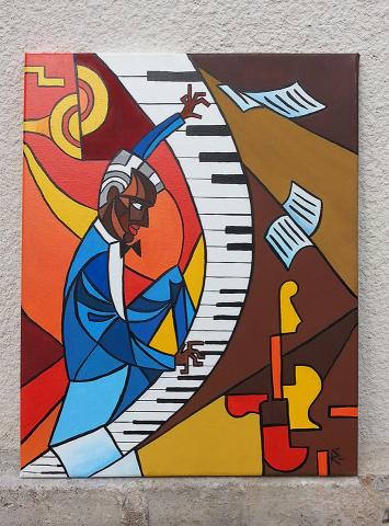 Akrilu tapytas kubistinis paveikslas. Drobė, su porėmiu, bet be rėmo. Dydis: 40x50cm.