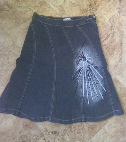 Pilkas,dzinsinis sijonas iki keliu.Dydis raso XS,S bet galima ir kaip M nesioti.Labai lieknina.Reali spalva 2 foto.