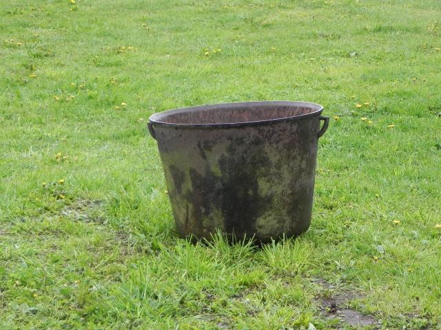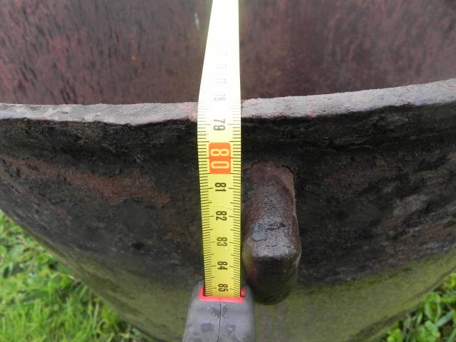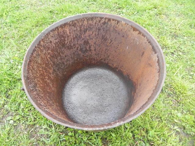 Sunkus spizinis puodas su rankenom.Aprudijes,reiktu nusmeliuoti,Vienoje vietoje buvo itrukes(ziema buvo paliktas su vandeniu),bet suvirintas.