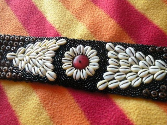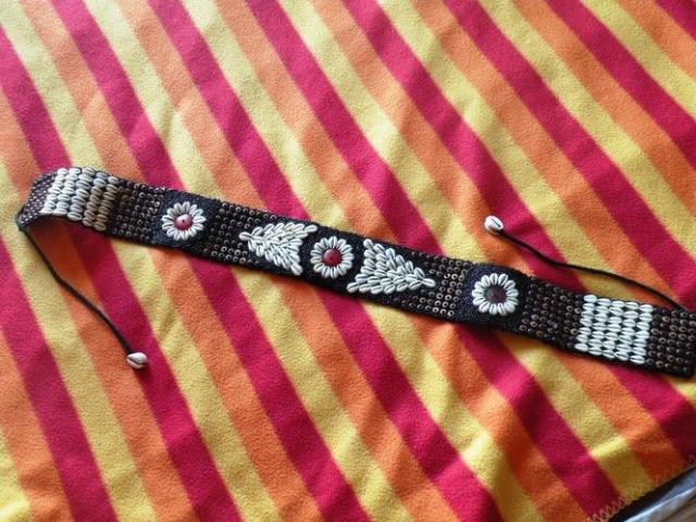 Diržas su karoliukais ir kriauklėmis. Trečioje foto matosi, kad pamestas vienas medinis karoliukas