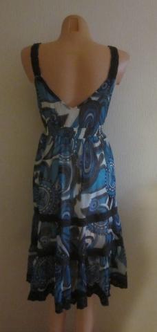 Plazdanti vasarinė suknelė. Dydis L, atitinka. Išmatavimai: Ilgis su petnešėlėmis ~107cm, rudos juostos po krūtine plotis 39x2cm, plotis ties pažastimis (ramybės būsenoje) 40x2cm, plotis ties pažastimis (ištempus) 52x2cm. Suknelė tempiasi, matuota ramybės būsenoje