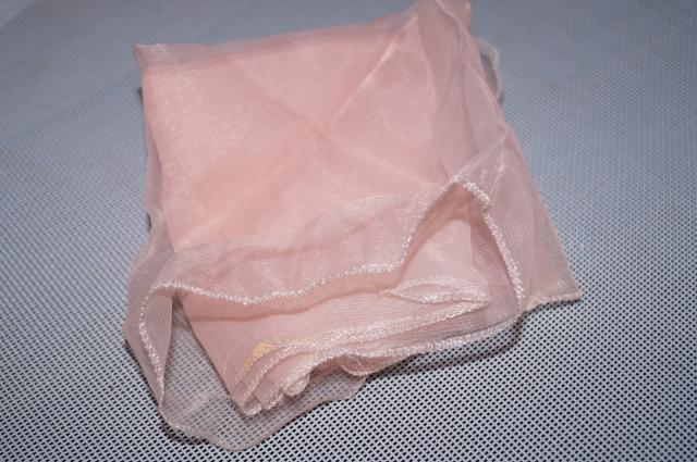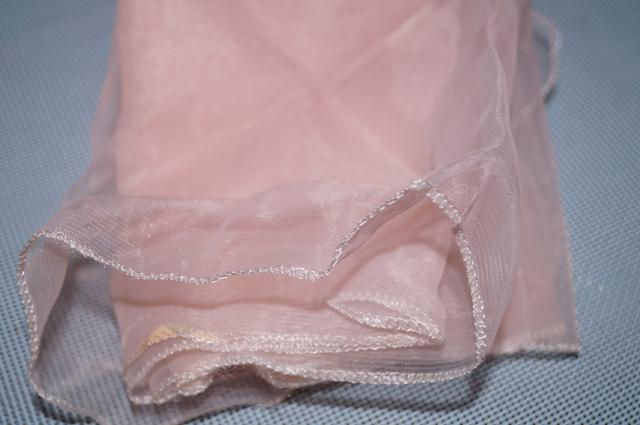 Plonas. lengvas šalikėlis, yra keliose vietose užkabintas audinys. Ilgis 103 cm, plotis 29 cm.