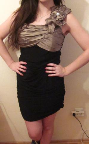 Proginė suknelė, 44 dydžio. Tinka ne tik XL dydžiui, tinka ir L, ir M (modelis nuotraukoje nešioja M dydį, jam tikrai tinka). Dėvėta vieną kartą per šimtadienį, t.y. 3 valandas. Bronzinė dalis slidžios medžiagytės, viena petnešėlė - nuostabi gėlė su blizgučiu viduryje. Juoda dalis puikiai tamposi, labai smagi medžiaga, paslepianti visus figūros trūkumas, o ypač - pilvuką. Tikrai NEMAINAU. Kaina derinama