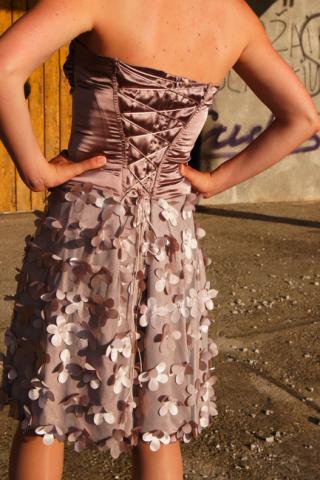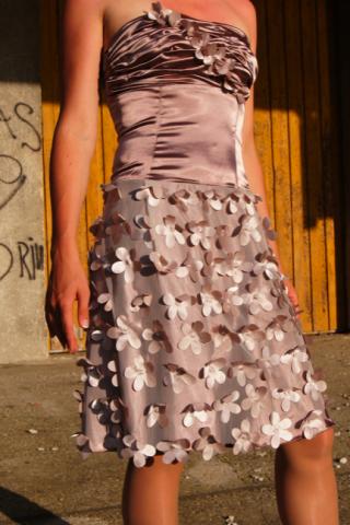 Žavinga, vienetinė proginė suknelė. Lengvai plevenančios gėlytės, priduoda vėjavaikiškumo, tačiau modeliukas ir spalva paverčia suknelę šventišku drabužiu, puikiai tiksianču išleistuvėms ar kitai svarbiai gyvenimo šventei pasipuošti. Pažymėta spalva neatspindi tikrosios, tiesiog tokios nėra tarp duodamo spalvų pasirinkimo. Tikroji spalva yra ta, kuri matoma nuotraukose. Nugara suvarstoma lyg korseto, tačiau viršus nėra kietas kaip tikro korseto, o atvirkščiai lengvas ir mielas prie kūno. Kadangi yra suvarst