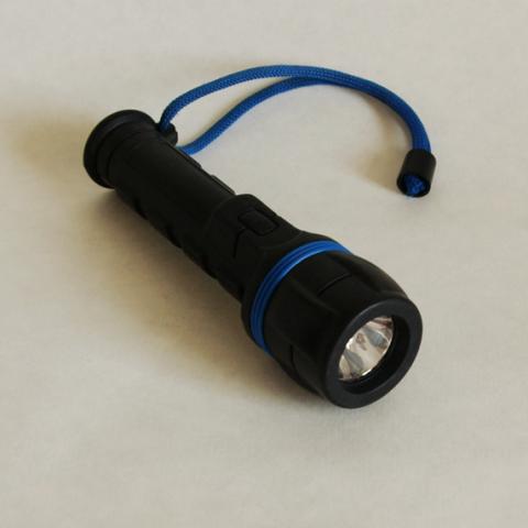 Rankinis prožektorius. Maitinamas dviem AA tipo elementais. Ilgis - 15,5 cm.