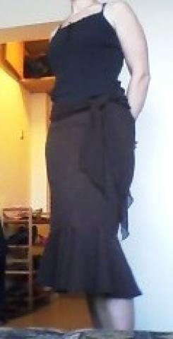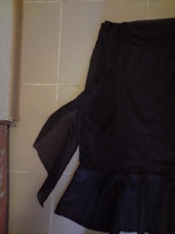 Puošnus sijonas, šiek tiek dėvėtas, bet tikrai nenudrengtas. Plona viskozė su kiek iškilia faktūra, per juosmenį rišamas šifoninis šalis.