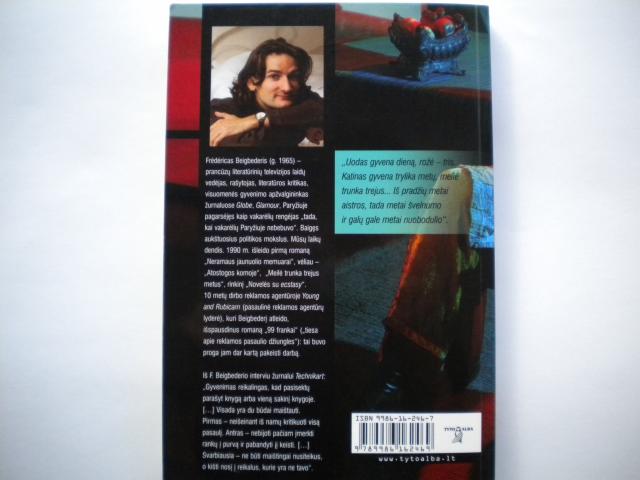 Gero stovio, skaityta tik 1 karta.! Jei sudomino, parasykite ! "Frédéricas Beigbeder (g. 1965) – vienas žinomiausių šiuolaikinių prancūzų rašytojų, televizijos, spaudos, reklamos, naktinių klubų žvaigždė. Šis autorius garsus ir įžūliais, provokuojamais savo tekstais, ir ekscentrišku gyvenimo būdu. Lietuvių kalba 2002 m. pasirodęs jo romanas „Meilė trunka trejus metus“ iškart tapo perkamiausia knyga, o knygos pavadinimas – visuomenėje tvirtai įsišaknijusia kliše."