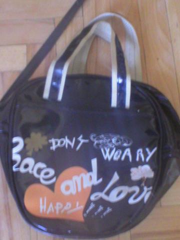 juoda rankine. su spalvotais uzrasais :"Don't worry. Bace and love happy!!!" ir nupiesta oranzine sirdele ir sjaip visokie piesinukai. lb grazi. nenutrinta.