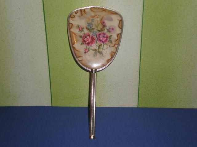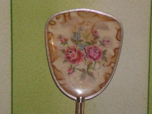 Rankinis veidrodelis su gale esanciu issiuvinetu geletu atvaizdu