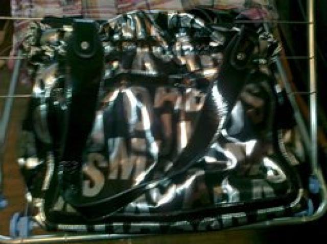 Neseniai pirktas, juodas, su raidėm, gan didelis, talpus, iš šonų yra kutosiukai tokie tien, bet kai juos sukšii į vidų kaip šiose nuotraukose jų nesimato.