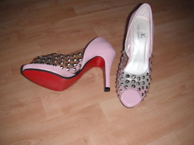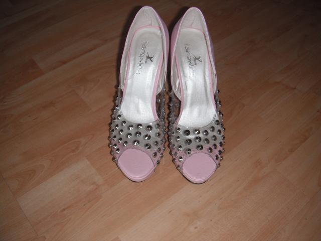 nauji rausvos spalvos bateliai,su kniedemis.priekis permatomas,kulniukas 10cm,pado ilgis 23,5.tik mazas defektukas gamybos brokas,nezymus kliju pedsakai.is arti matomi.