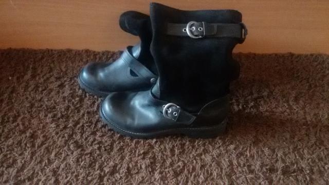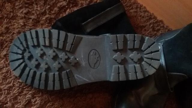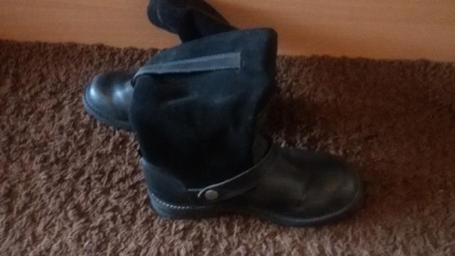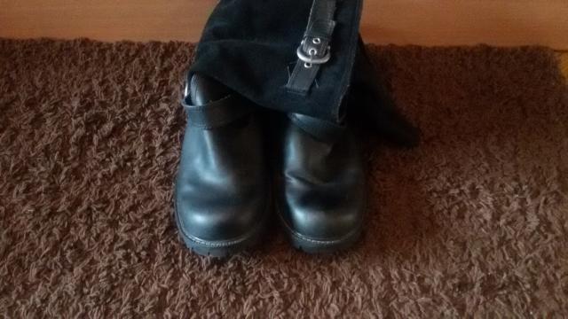 Juodi moteriški batai, beveik nedevėti. sudėtis: Avalynės viršus: oda (ir kitos medžiagos); yra metalinės sagtys. Avalynės pamušalas ir įklotė: tekstilė; Padas: kitos medžiagos (konkrečiai nenurodyta).