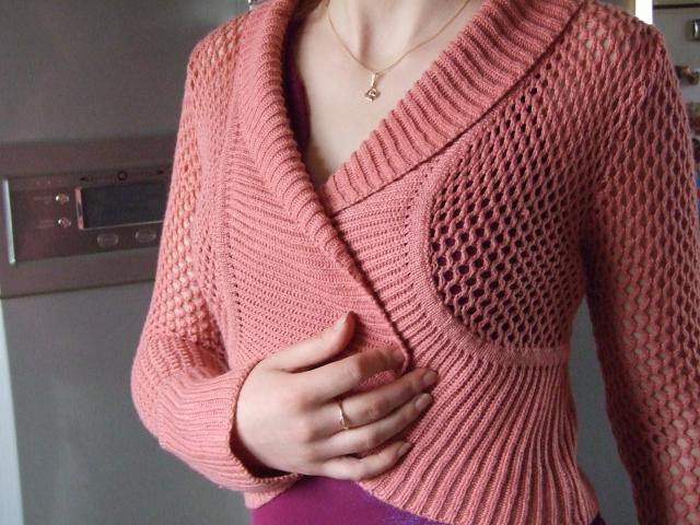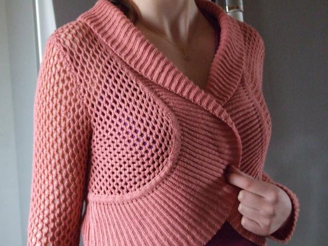 Rožinis kiauriaraščiu nertas megztukas. Ilgis nesiekia klubų.