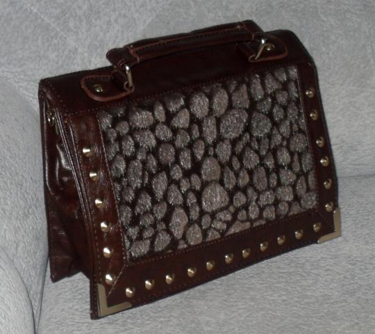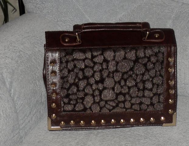 Ruda nedidelė rankinė. Dugno plotis ~ 10cm, ilgis ~ 25cm, ausktis ~ 20cm, ausktis su rankenom ~ 25cm.