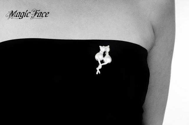 Sagė "Katinukai".Sagė "Katinukai". Pagaminta iš nerudyjančio plieno ir padengta balta emale bei inkrustuota cirkonio akmenukais. Šią sagę galima nešioti ir kaip pakabuką. Sagės ilgis - 5 cm, plotis - 2,5 cm. Kaina 30 lt.