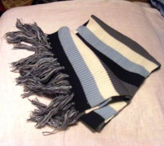 Mėlynų atspalvių dryžuotas šalikas. Šiltas, apie 130 cm ilgio.