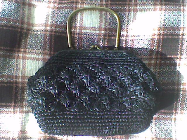 Gal 50 metų senumo rankinė iš močiutės spintos :) realiai juoda, fotografuojant atsispindėjo. Pinta iš kažkokio sintetinio siūlo. Užsegimas nėra labai tvirtas, bet laiko. Manau galima pataisyti, jei norėsis. Viduje pamušalas ir kišenėlės. aukštis be rankenos 30 cm, plotis 35 cm per plačiausią vietą