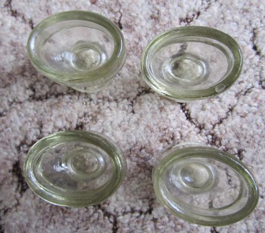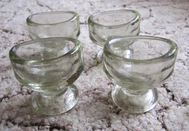 Senos, storo stiklo taurelės. Telpa apie 10 ml. ilgis 4 cm, plotis 3 cm, aukštis 4cm. Foto visos kiek yra.