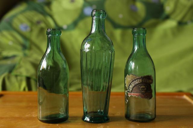Du nuo hematogeno (0,25l), tas grazus (~0,35l) nezinau nuo ko (nuskiles gabaliukas stiklo apacioj). Vidurinio butelio stiklo spalva grazi, tarpine tarp zalios ir melynos. Absentas gerai jame ziuretusi :)