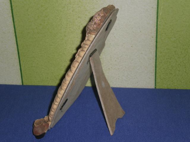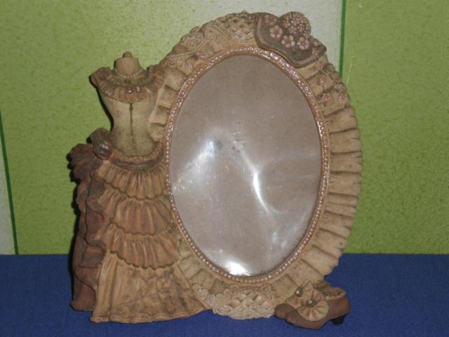Senovinis antikvarinis keramikinis ir kartoninis remelis nuotraukai moters siluetas su suknele bateliais ir kepure