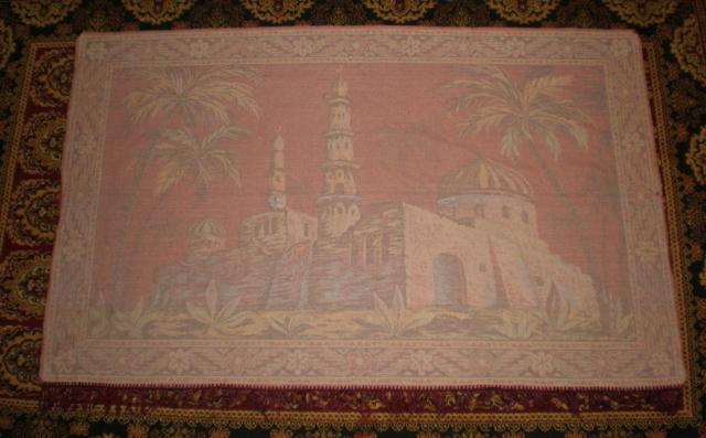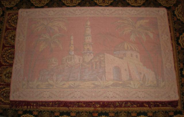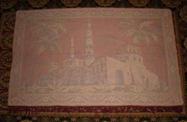 Senovinis didelis sienos kilimas su arabisku pastatu motyvais, turkiski minaretai, palmes, pastatai