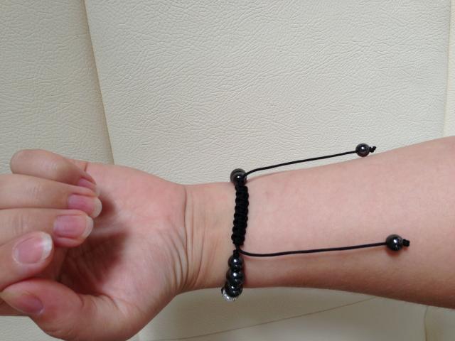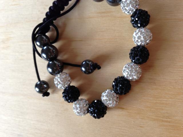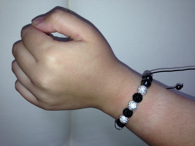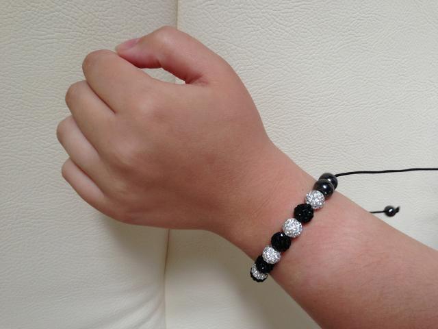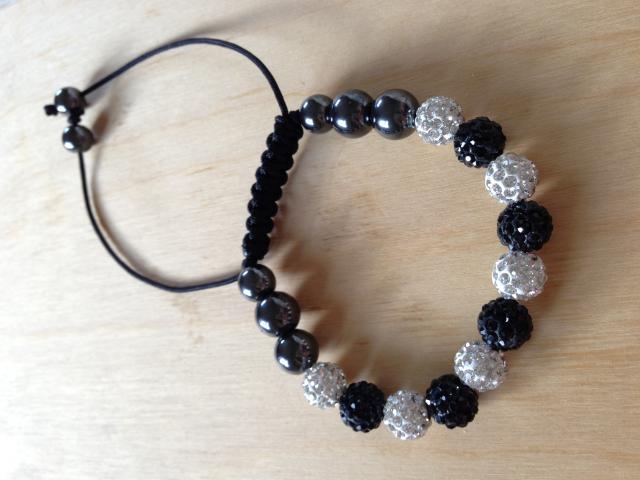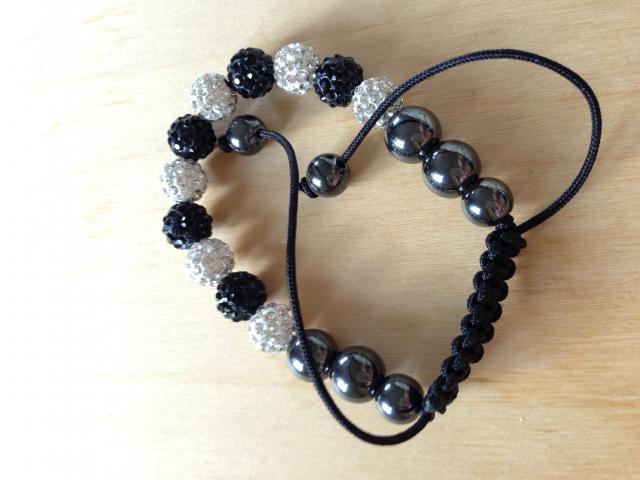 NAUJA *konktrastinga ir puošni disco karoliukų apyrankė; *karoliukų diametras: 10mm; *hematito karoliukų diametras: 8 ir 10mm; *nailoninės dalies ilgis: 33mm; *nailoninės dalies plotis: 8mm; *ilgis: 185-270mm; Sudėtis: juodas nailonas; juodas juvelyrinis plastelinas; juodi kristaliukai; natūralū hematito karoliukai;