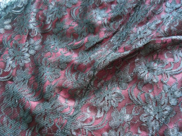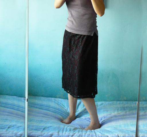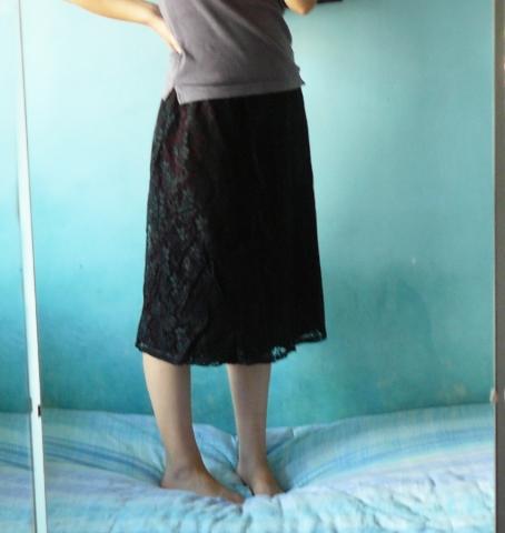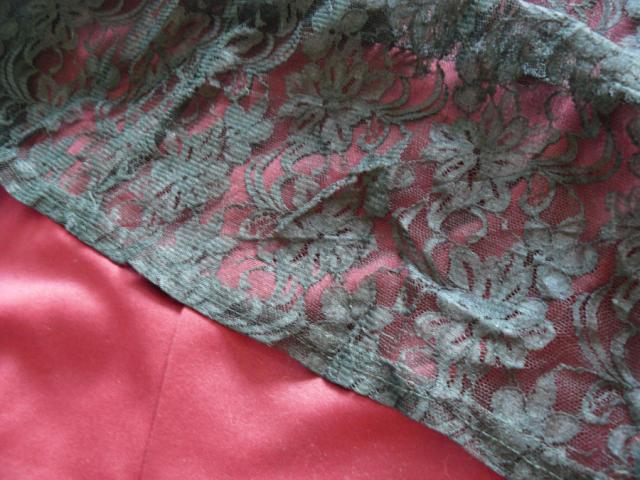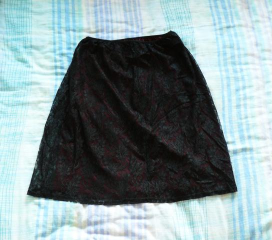 Bordo spalvos pamušalas, o ant viršaus gėlėtas juodas gipiūras. Su guma, todėl tamposi. Ramybės būsenoj juosmuo 66, išsitempia iki 92cm, klubai 94-104cm, ilgis 60cm. Man jis gerokai perdidelis :) manau tai M, L dydziam