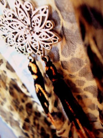 Elegantiski ir velniskai puosnus ranku darbo auskarai su metaline gele ir dvispalviu pakabuku is silko virvuciu :)