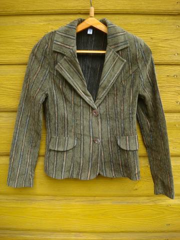 Šiltas chaki spalvos dryžuotas švarkelis, įliemeniuotas, velvetinis, švelnus. Klaiskinio tipo. Su petukais. Be defektų.