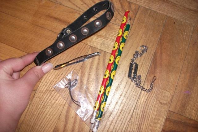apyrankė - britva, paprasti pieštukai, odinis antkaklis, pincetas, telefono pakabukas - nokia