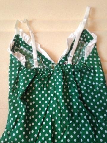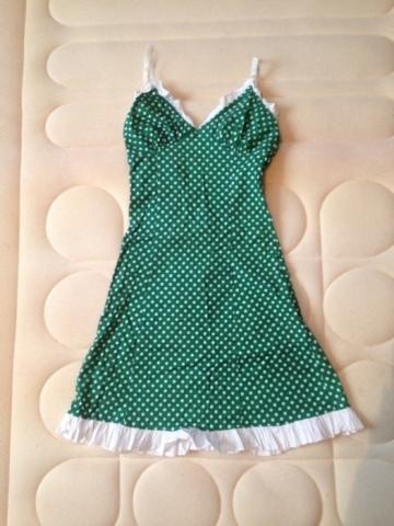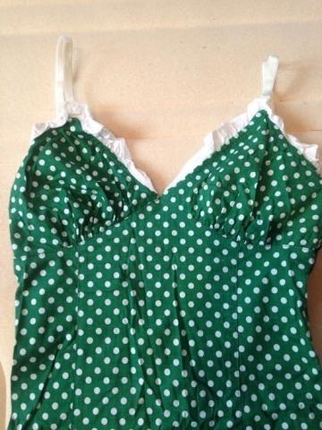 Žaisminga žalia suknelė su baltais žirneliais. Nugaroje užtrauktukas ir gumytė, petnešėlės reguliuojasi. Kelis kartus užsidėta, kaip nauja. Dydis nurodytas 36, bet mažinta, sakyčiau net 32. Ilgis 80cm plius šleikutės (reguliuojasi) Liemuo apie 30cm Klubai apie 36cm. Medžiaga kažkiek tempiasi. Mažai krūtinei, galima nešioti be liemenuko.
