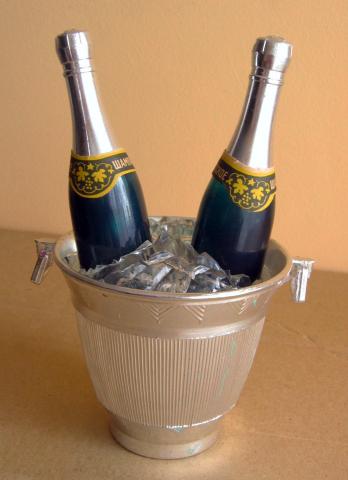 plastikinis, tarybiniu laiku suvenyras ' 2 sampano kibirelyje su ledukais':) susideda is 4 daliu, kibirelis, 'ledukai', 2 sampano, daiktas senas, niekas nesuluze, bukle nebloga, aukstis (su buteliais) apie 13cm