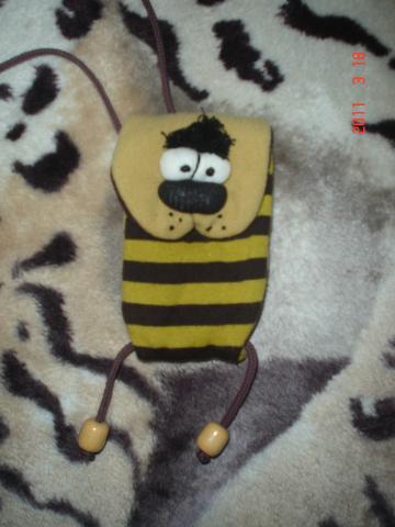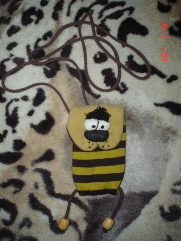labai grazus nuotaikingas telefono deklas,galima persijuosti per peti yra ilga virvele.kaina:12lt