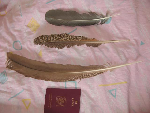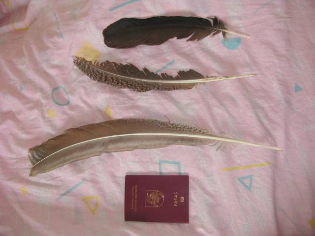 jų būklė matosi nuotraukose, dydžiui nustatyti padėjau pasą, plunksnos nufotografuotos iš abiejų pusių.