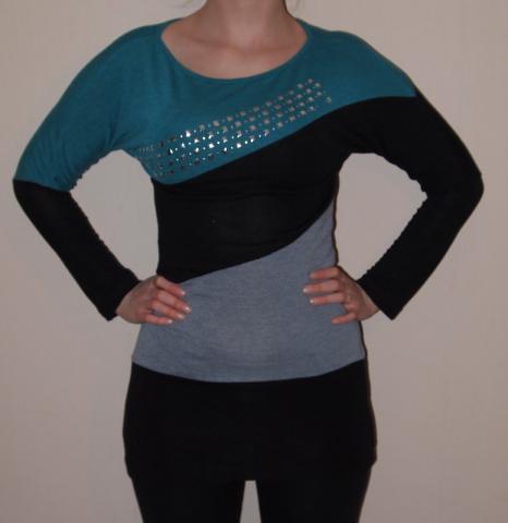 Trijų spalvų tunika ,puošta blizgiais kvadračiukais ir rutuliukais.Dviejų papuošimų nebėra, bet iš pačio krašto todėl net nematyti.Ant etiketės rašo,kad xl/xxl, bet as nešioju m ir man kaip tik.