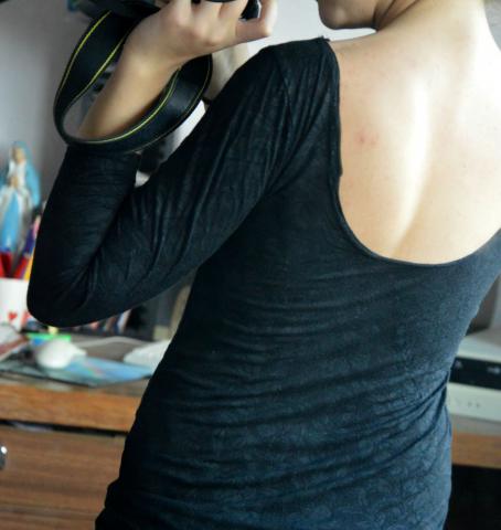 Trumpa juoda elegantiška suknelė atvira nugara ir gėlėtais raštais