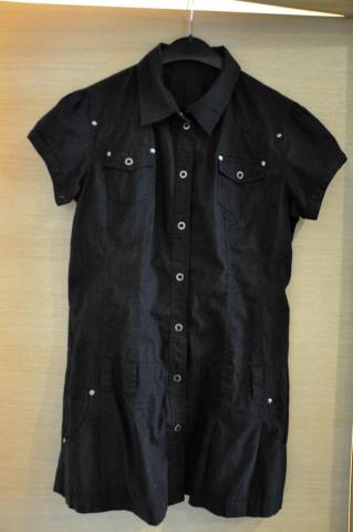 Juoda, labai trumpa marškinių tipo suknelė. Pirejyje per visą ilgį susegama metalinėmis sagutėmis (knopkėmis). Viršus marškinių stiliaus. Apačia šiek tiek platėjančio trumpo sijono tipo. Dvi užsegamos kišenėlės viršuje ir dvi atviros apačioje. Dydį rašo 42, bet labaiu tiktų 40. Yra skylės diržui. Vilnius, Kaunas, Panevėžys. Siunčiu į kitus miestus.