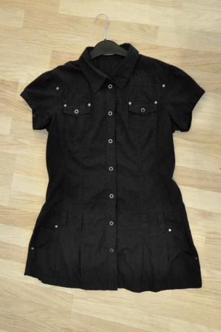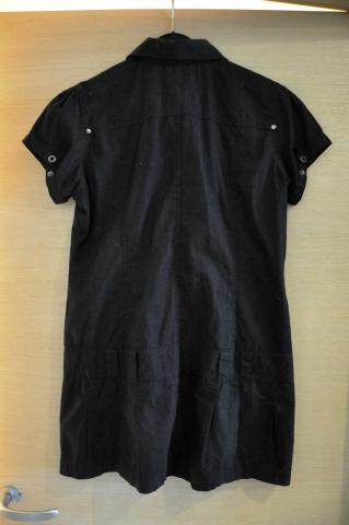 Juoda, labai trumpa marškinių tipo suknelė. Pirejyje per visą ilgį susegama metalinėmis sagutėmis (knopkėmis). Viršus marškinių stiliaus. Apačia šiek tiek platėjančio trumpo sijono tipo. Dvi užsegamos kišenėlės viršuje ir dvi atviros apačioje. Dydį rašo 42, bet labaiu tiktų 40. Yra skylės diržui. Vilnius, Kaunas, Panevėžys. Siunčiu į kitus miestus.
