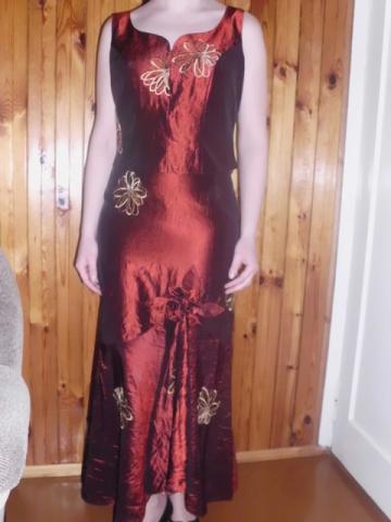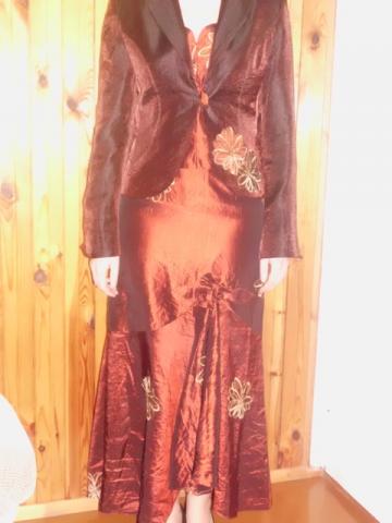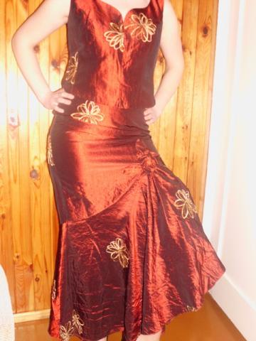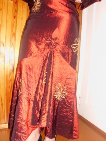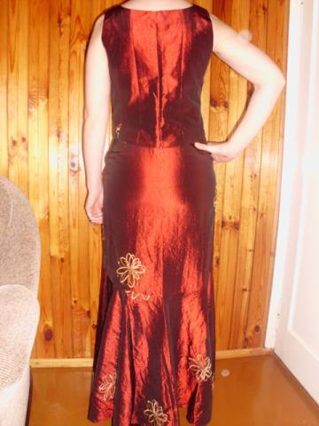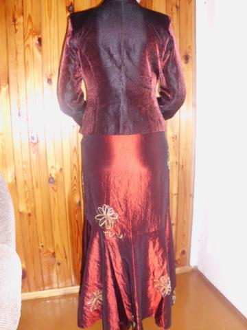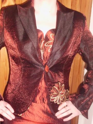 Labai puošnus, vakarinis, elegantiškas bordo spalvos kostiumėlis. Siuvinėtas auksinės spalvos siūlais, gėlytėmis. Kostiumėlis trijų dalių: korsetas, sijonas, švarkelis. Dėvėtas tik kartą. Dydis:40. Kaina: 240Lt