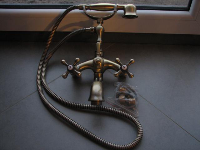 Naujas, sendinto stiliaus, bronzinės spalvos vandens maišytuvas su dušu.