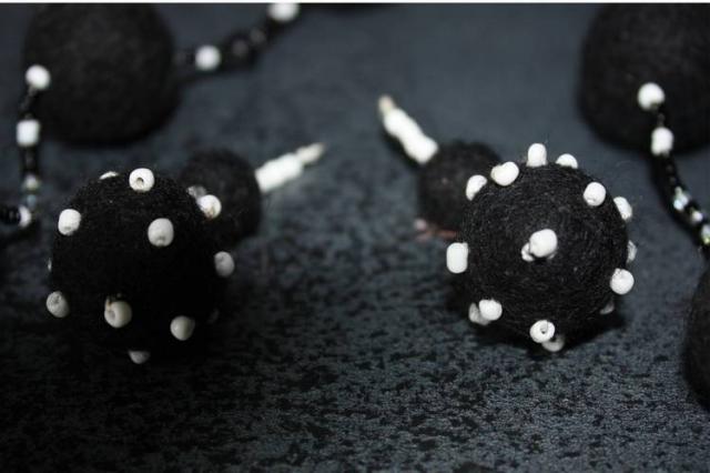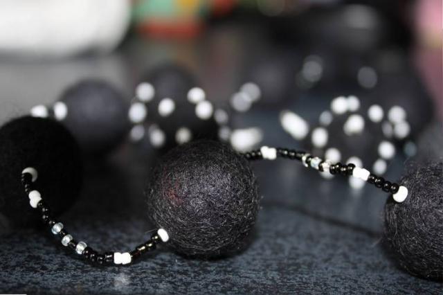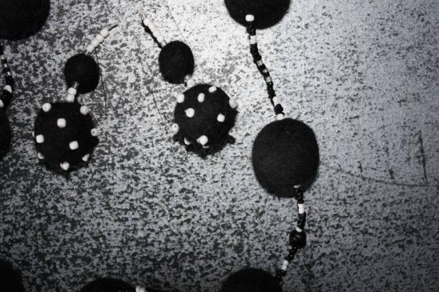 Juodas veltos vilnos rinkinys su baltais karoliukais. (auskarai ir vėrinys)