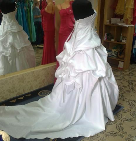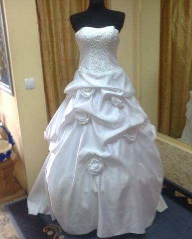 Sniego baltumo, princesės silueto vestuvinė suknelė. Suknelė užrišama nugara, todėl tinka 38-42 dydį nešiojančioms merginoms. Yra prisegamas šleifas, kuris puikiai atrodys nuotraukose.