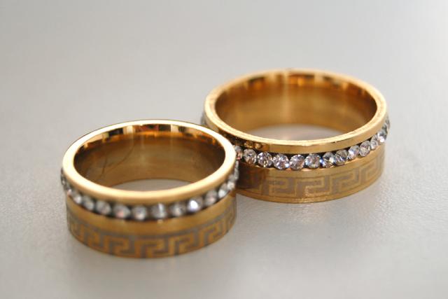18 K auksu pildytas plieniniai žiedai.Marginti Versace raštais ir puošti kristalais. Yra įvairių dydžių. Galima pirkti ir vieną žiedą. Auksu pildyti papuošalai nesukelia alergijos, nejuoduoja, yra ilgaamžiai bei tinkami nešioti net ir turintiems itin jautrią odą. Yra įvairių dydžių. KAINA UŽ 2 VNT.