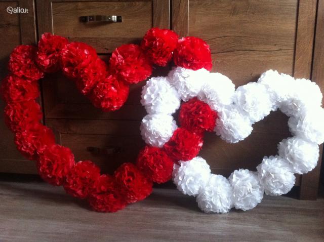 Vestuvių dekoracija, kabinama ant sienos. Raudonos širdies aukštis apie 65 cm, baltos širdies aukštis apie 55 cm. Abiejų širdžių plotis apie 118 cm. Širdys sujungtos.